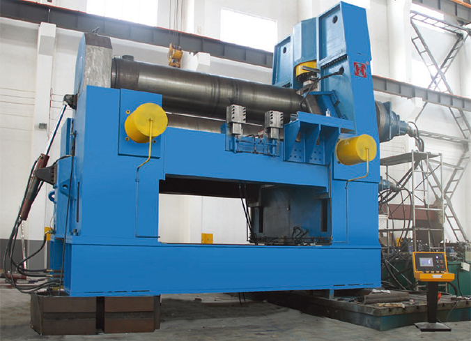 該機(jī)結(jié)構(gòu)型式四輥式,上輥為主傳動,通過減速機(jī)的輸出齒輪與上輥齒輪嚙合,為卷制板材提供扭矩;下輥作垂直升降運(yùn)動,通過液壓缸內(nèi)的液壓油作用于活塞而獲得,以便夾緊板材,為液壓傳動;在下輥的兩側(cè)設(shè)有側(cè)輥并沿著機(jī)架導(dǎo)軌作傾運(yùn)動,通過絲桿絲母蝸輪蝸桿傳動;該機(jī)優(yōu)點是板材端部預(yù)彎及卷圓可以在同一臺設(shè)備上進(jìn)行。